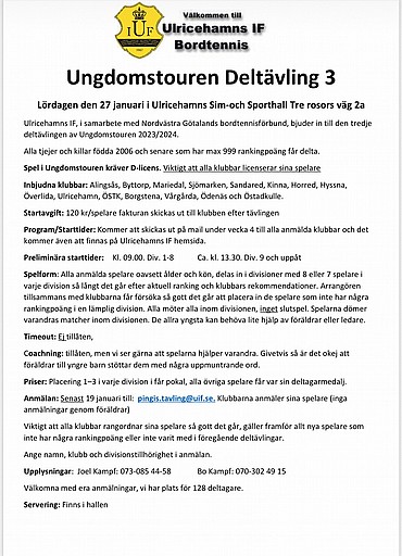 Lördagen den 27/1 bjuder Ulricehamns IF bordtennis in till den tredje delen av ungdomstouren 2023-2024.