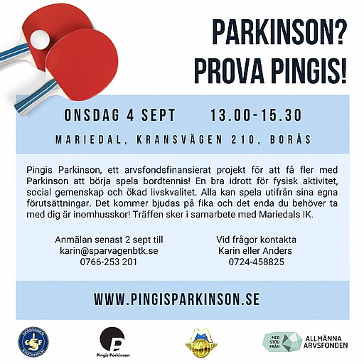 Den 4/9 kommer projektet Pingis Parkinson tillsammans med Mariedals IK att genomföra ett event där personer med Parkinson bjuds in att prova bordtennis. Planen är sedan att starta en träningsgrupp för målgruppen.