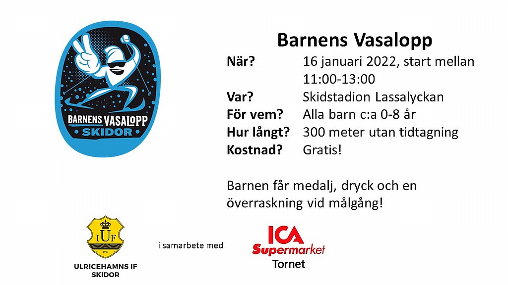 Alla barn mellan 0-8 år välkomna att ta på sig nummerlapp och prova på att åka ett Vasalopp. Samma kontroller som i riktiga Vasaloppet passeras och vid målgång blir det medalj, blåbärssoppa och någon liten överraskning.